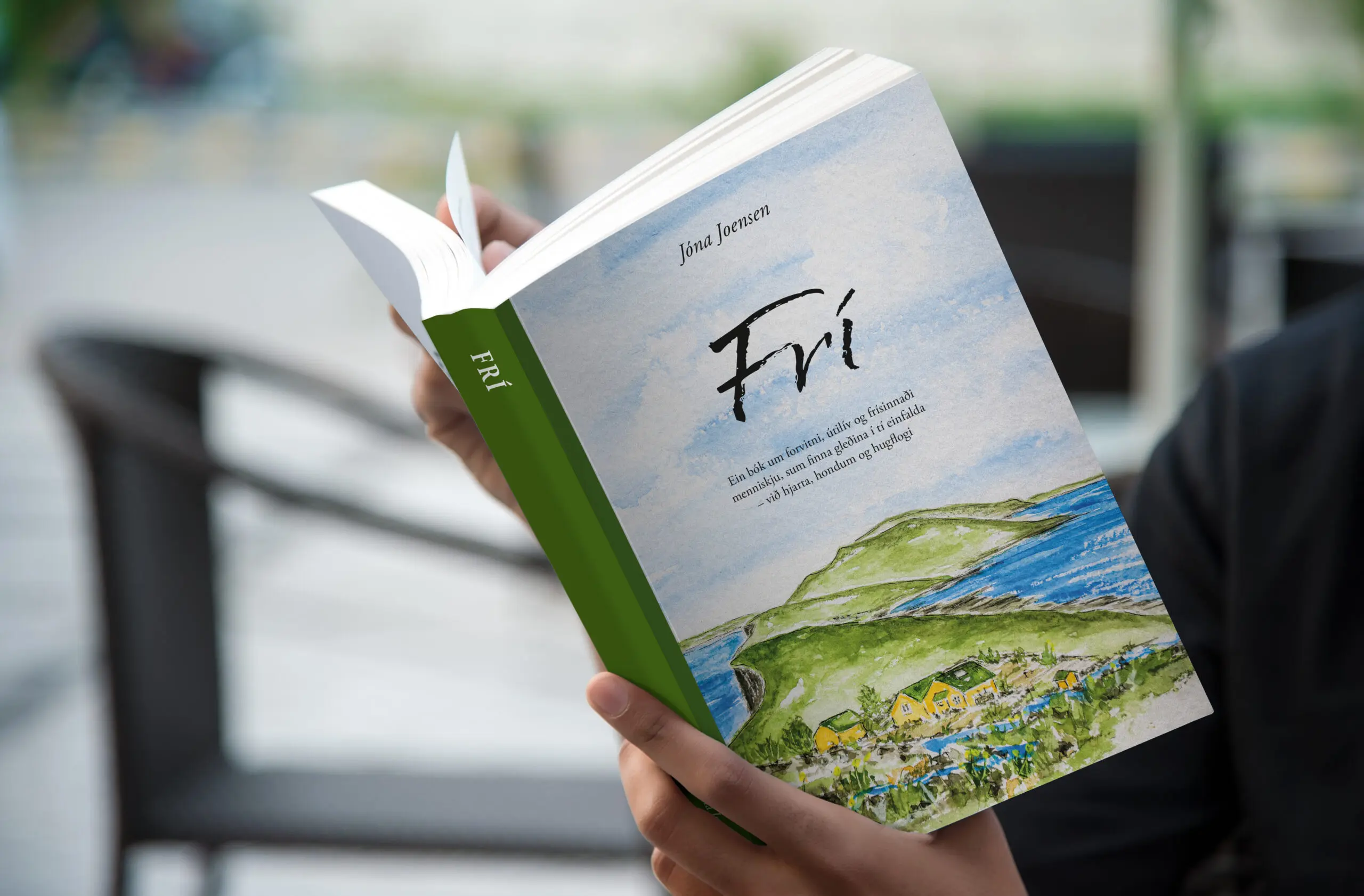Tað er Jóna Joensen, ættað úr Syðrugøtu, búsitandi í Sveis, ið hevur skriva bókina FRÍ. Íblásturin kemur frá uppvøkstrinum í Føroyum, ferðum kring knøttin og lívinum á garðinum í Sveis, sum hon, saman við manni sínum Thomas, hevur umskapað til eitt gistingarhús og eina sjálvbjargna oasu við grønmetið, fruktum, urtum og víni.