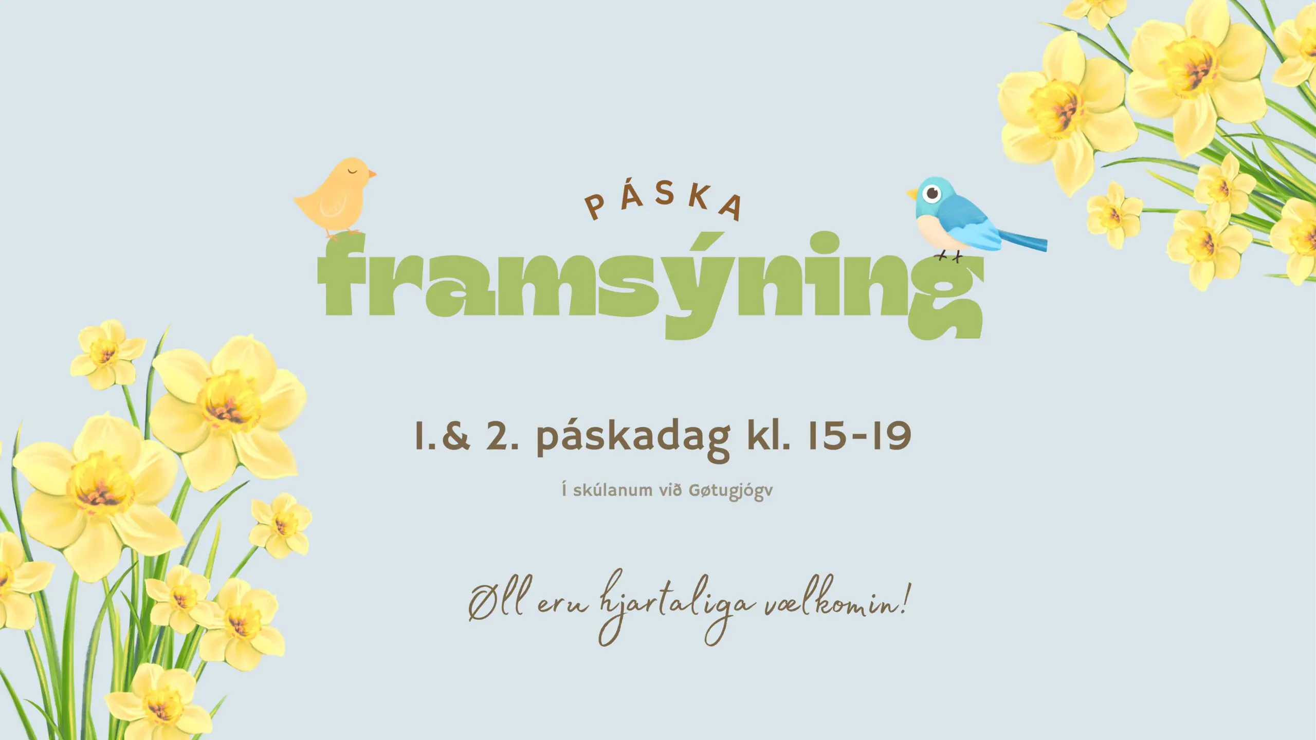 1. og 2. páskadag, verður listaframsýning í fimleikahøllini í skúlanum við Gøtugjógv. Tað eru listafólk úr kommununi, sum sýna sína list fram. Øll eru hjartaliga vælkomin at vitja listaframsýningina.